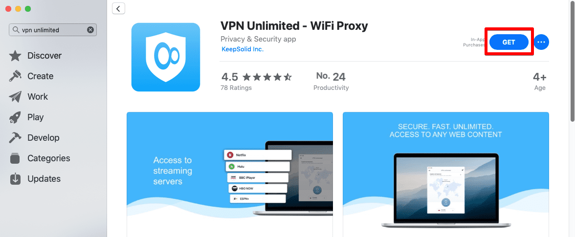 سواء كان الخيار الذي تختاره ، افتح صفحة تطبيق VPN Unlimited وانقر على زر Get / Install.(حصل\ثبت)