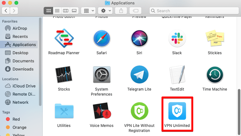 بعد اكتمال عملية التثبيت ، سيظهر رمز VPN Unlimited في مجلد  Applications (التطبيقات).