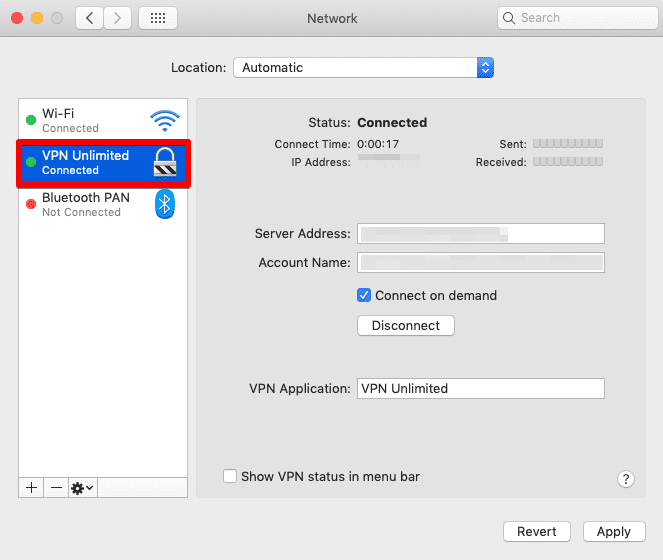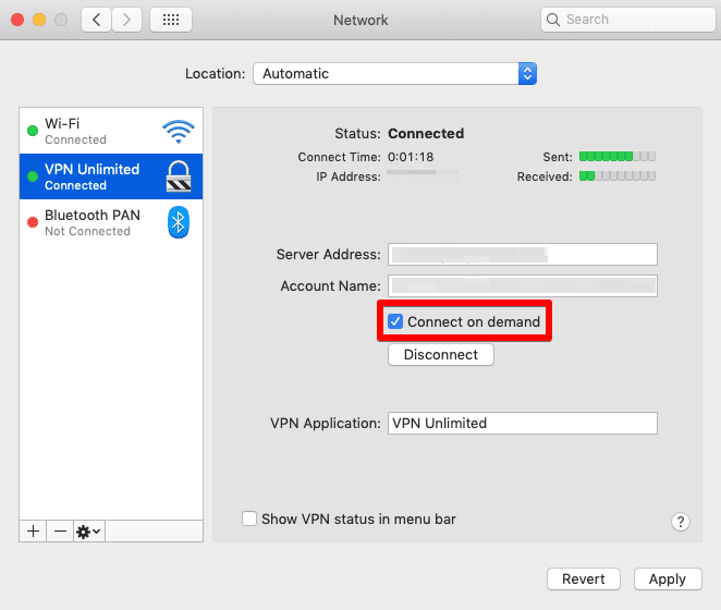 لتمكين الاتصال عند الطلب أو تعطيله ، انتقل إلى System Preferences (تفضيلات النظام) >  Network (الشبكة) وحدد ملف تعريف VPN Unlimited ، وقم بتعيين أو إزالة مربع الاختيار المناسب.