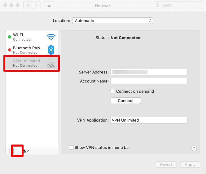 بعد ذلك ، انتقل إلى System Preferences (تفضيلات النظام) >  Network (الشبكة) وحدد ملف تعريف VPN Unlimited ، وانقر لحذف هذا التكوين.