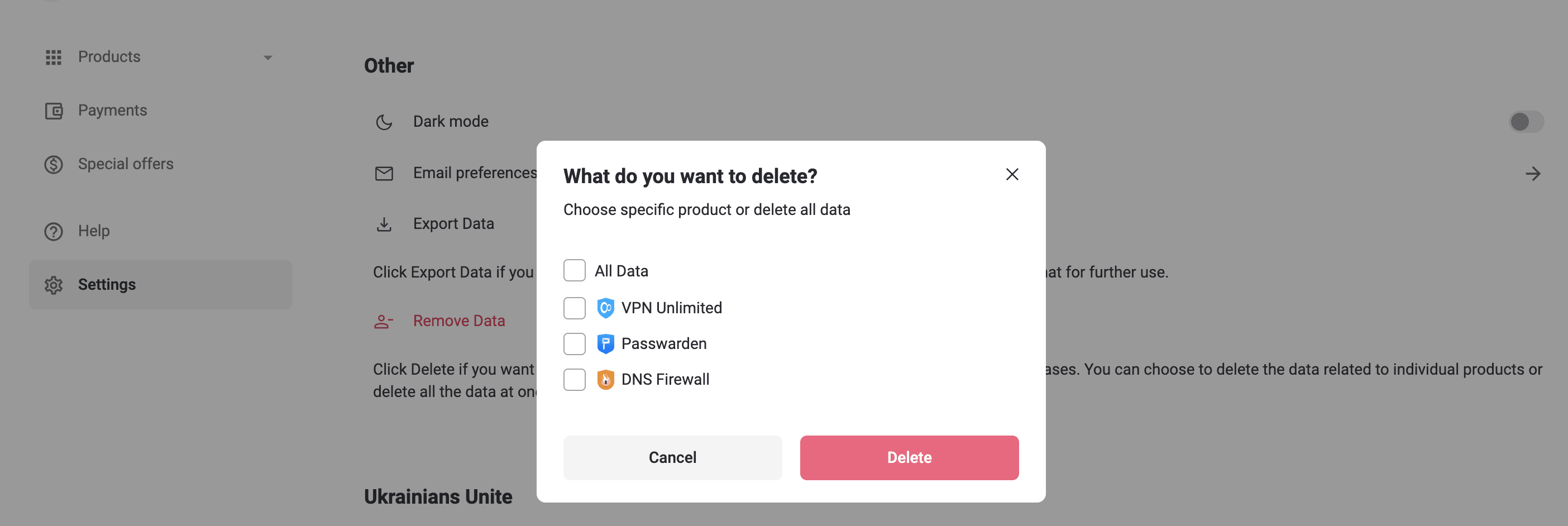 - So löschen Sie Daten für bestimmte Dienste: Wählen Sie die Dienste aus, die Sie löschen möchten (z.B. VPN Unlimited, Passwarden, DNS Firewall) und klicken Sie auf Delete (Löschen).
