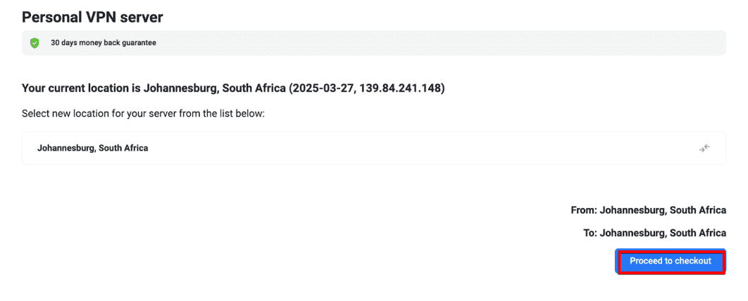 - Klicken Sie auf Change (Ändern), wählen Sie den gewünschten Ort aus, klicken Sie auf Proceed to checkout (Zur Kasse gehen) und schließen Sie die Zahlung mit einer der verfügbaren Methoden ab.