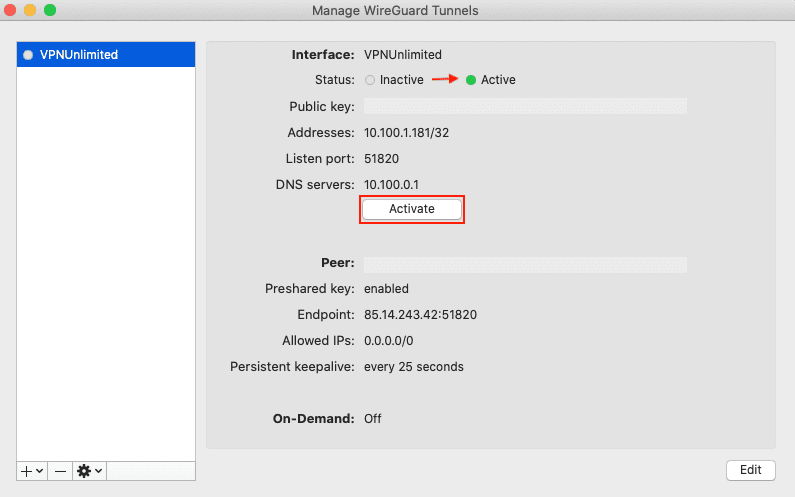 6. Aktivieren Sie Ihre WireGuard-VPN-Verbindung auf Ihrem Mac und genießen Sie erstklassige Privatsphäre im Internet.