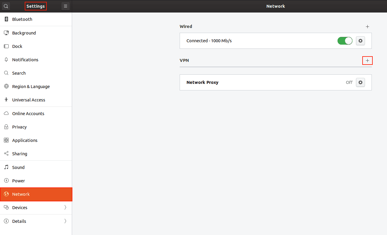 3. Vaya a Settings (Ajustes) > Network (Red) y haga clic en + en la sección VPN.