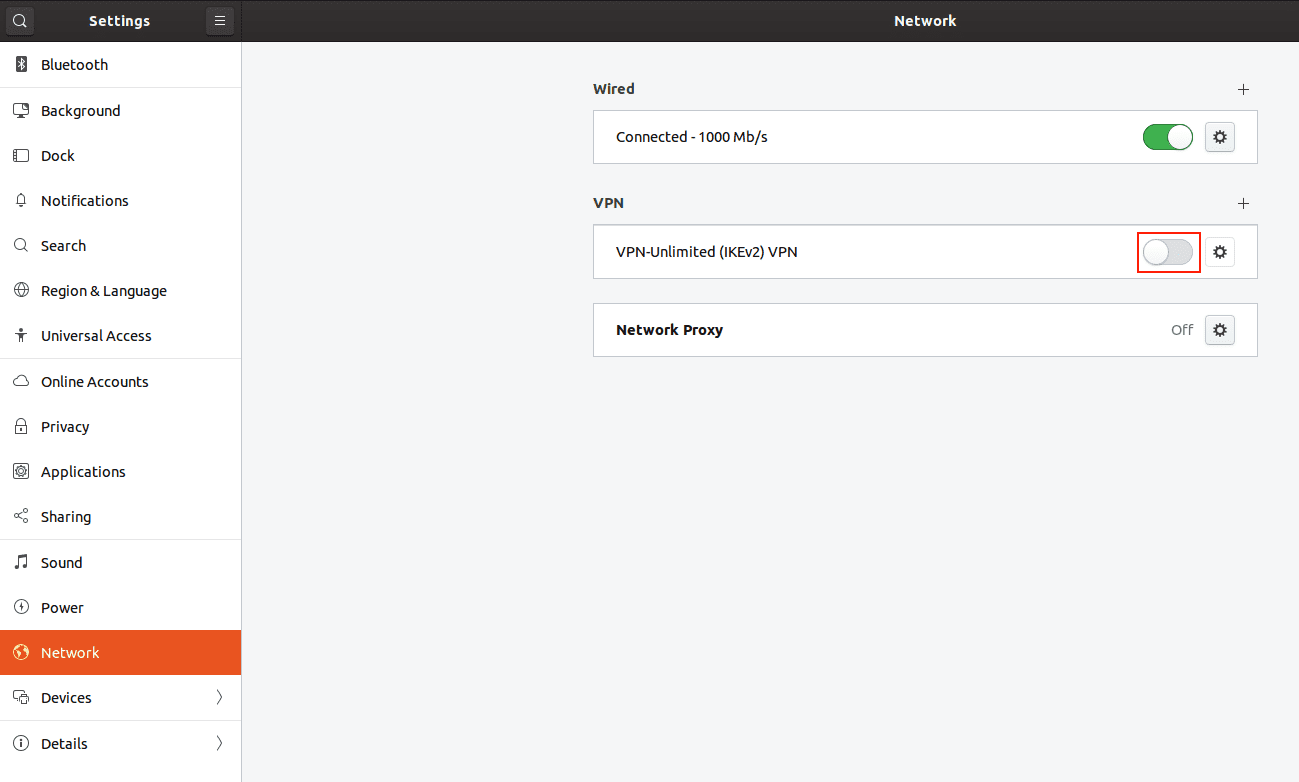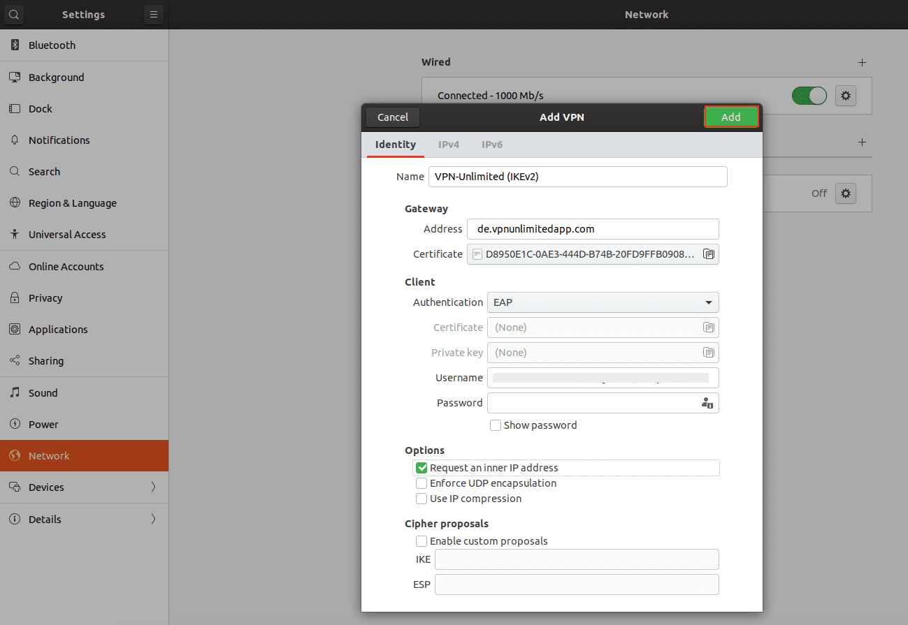 6. Para establecer la conexión VPN, habilite la opción necesaria e ingrese la contraseña de la sección Configuración del dispositivo. Su conexión VPN IKEv2 se establecerá en unos segundos.