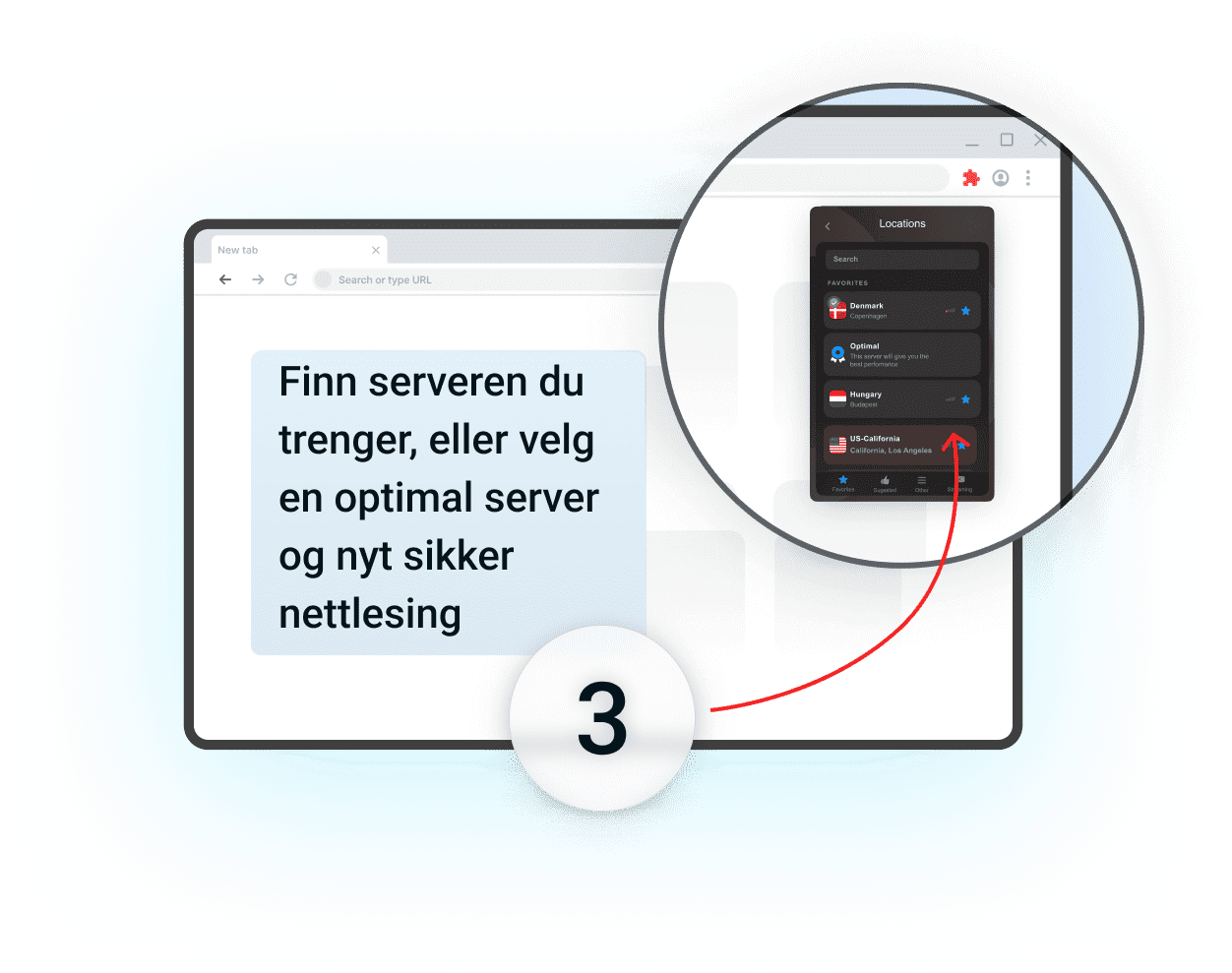 Med utvidelsen vår kan du koble deg til en av over 3000 lynraske servere på mer enn 80 steder i verden. Vår perfekte infrastruktur gjør at du kan omgå geografiske begrensninger og nyte hvilket som helst innhold uansett hvor du er.