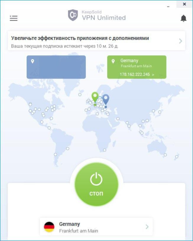Начнем с главного экрана нашего приложения VPN для Windows. Здесь вы можете включить или выключить ваше VPN соединение. Чтобы это сделать, нажмите на кнопку Старт/Стоп.