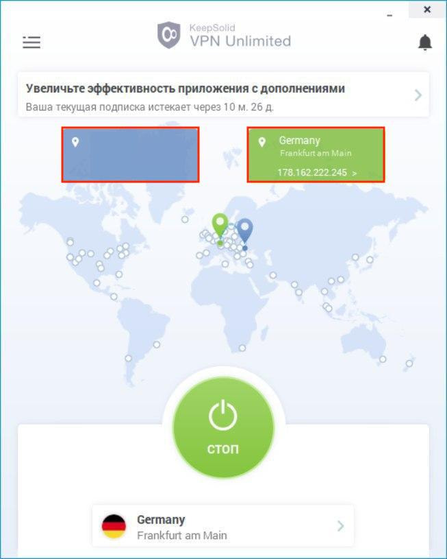 Также на главном экране вы можете увидеть карту, которая отображает ваш реальный и виртуальный IP адрес. Чтобы увидеть более подробную информацию, нажмите на синие и зеленое поле соответственно.