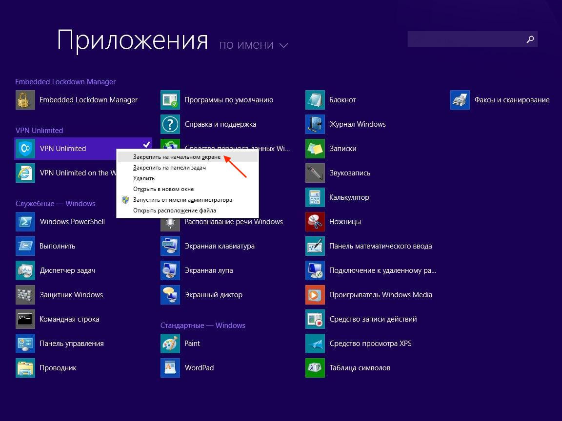 Чтобы иметь возможность быстро запустить программу VPN для Windows 8/8.1, нажмите правой кнопкой мыши на ярлык VPN Unlimited и выберите Закрепить на начальном экране.