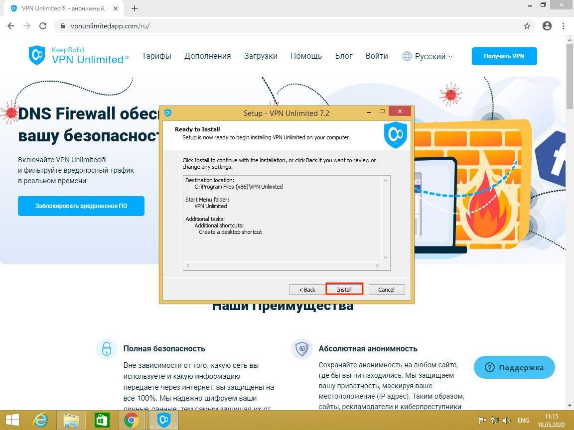 Чтобы начать процесс установки VPN для Windows 8/8.1, нажмите Install.